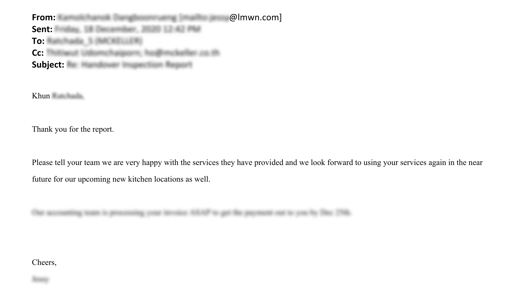 “ตลอดระยะเวลาในการให้บริการของเอ็มเคแอล ทางบริษัทฯ ได้แสดงให้เห็นถึงความเชี่ยวชาญในด้านการบริหารโครงการ สนองตอบต่อวัตถุประสงค์ของการว่าจ้างเป็นอย่างดี”