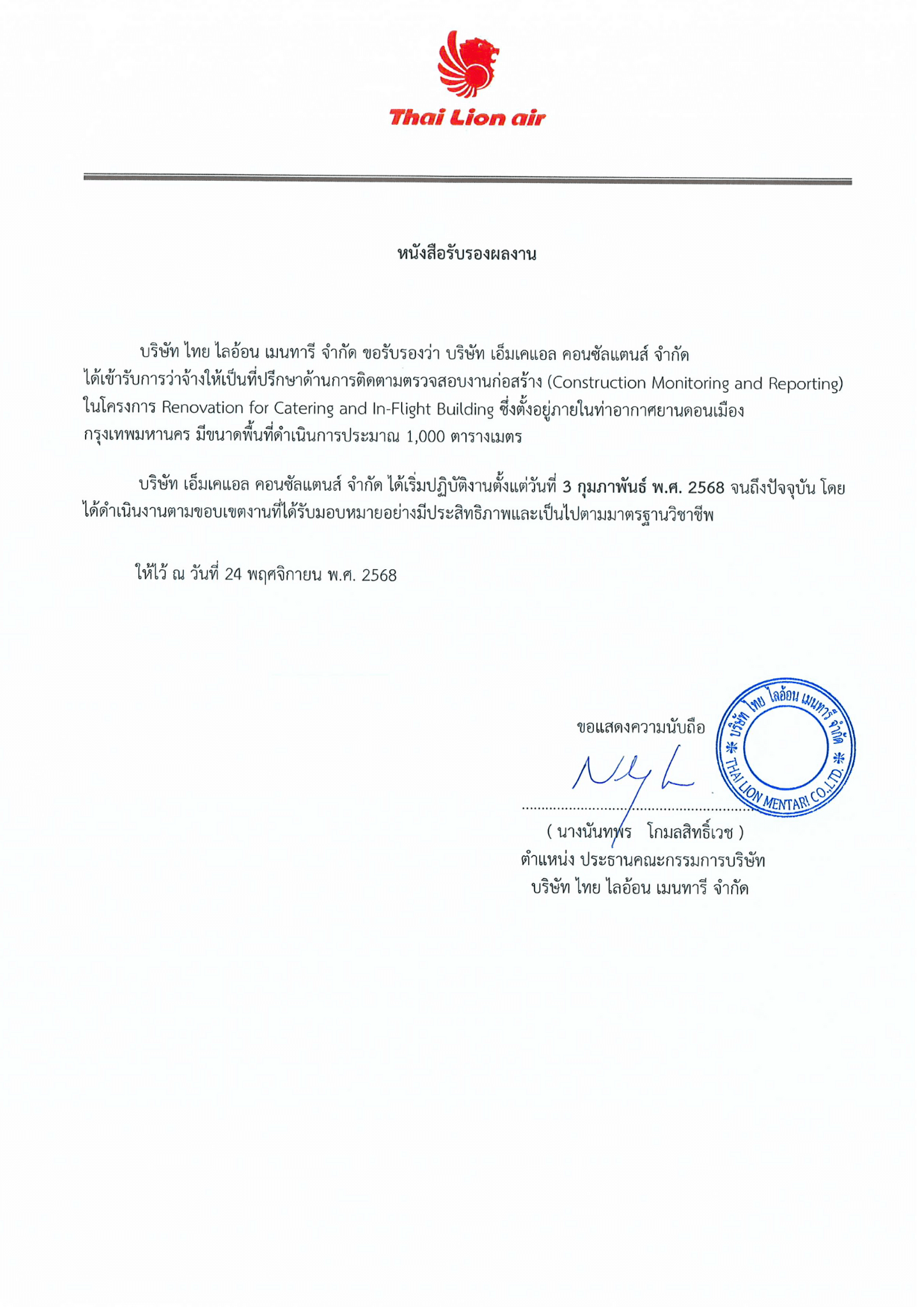 “ตลอดระยะเวลาในการให้บริการของเอ็มเคแอล ทางบริษัทฯ ได้แสดงให้เห็นถึงความเชี่ยวชาญในด้านการบริหารโครงการ สนองตอบต่อวัตถุประสงค์ของการว่าจ้างเป็นอย่างดี”
